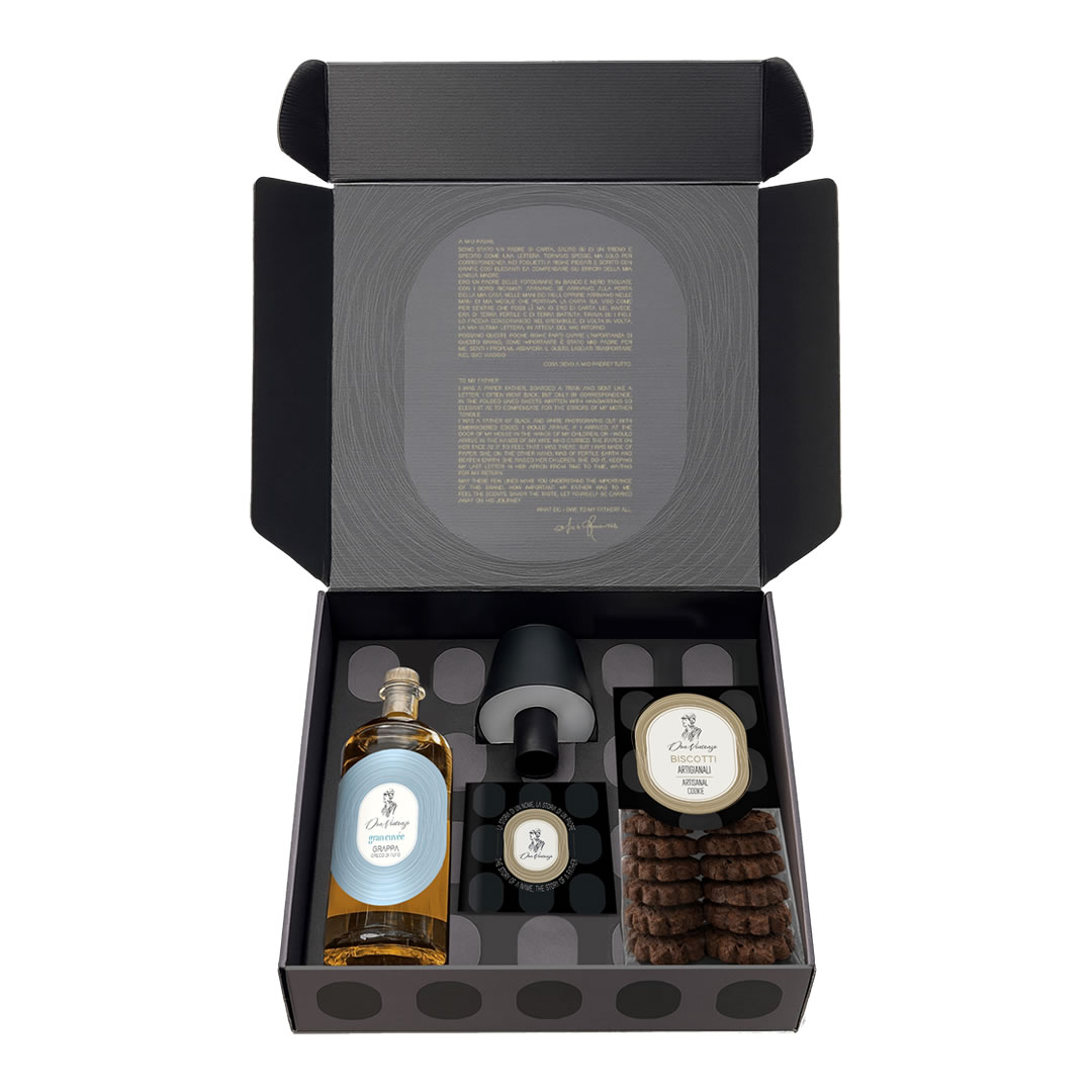 La linea Don Vincenzo nasce come gesto di riconoscenza, è la promessa di non dimenticare mai da dove veniamo. Racconta la storia di un uomo di sacrificio, un custode di valori semplici e autentici. La sua eredità rivive nei nostri prodotti, ogni creazione porta con sé la cura, l’amore e il rispetto che Don Vincenzo ha insegnato alla sua famiglia. Le box Don Vincenzo trasformano ogni occasione in un momento speciale. Pensate per chi ama regalare emozioni uniche, combinano eleganza, qualità artigianale e un tocco di raffinatezza.
